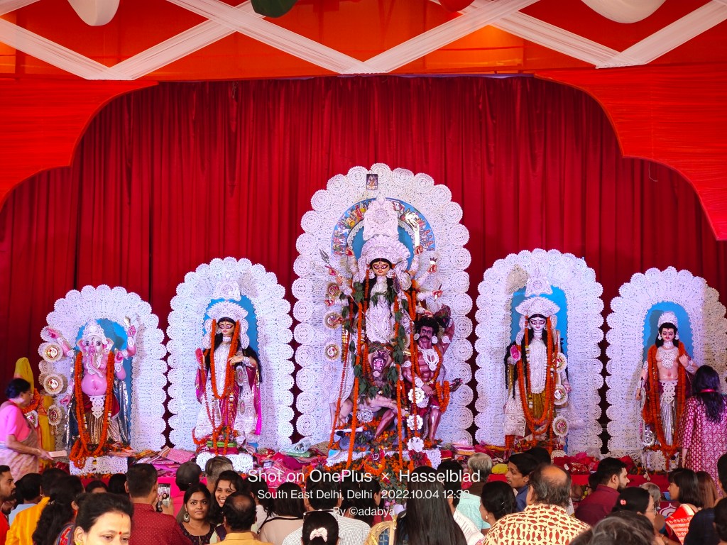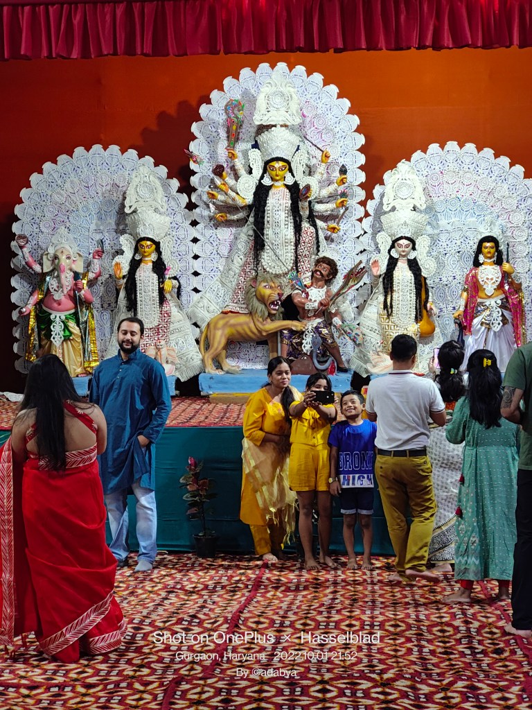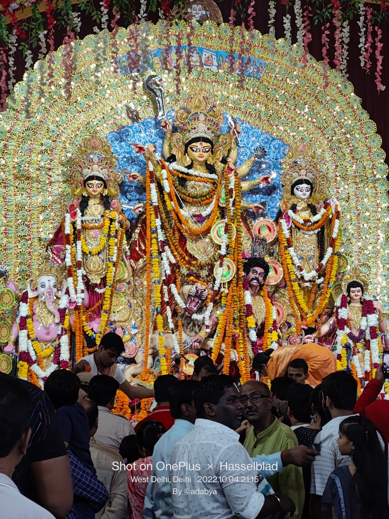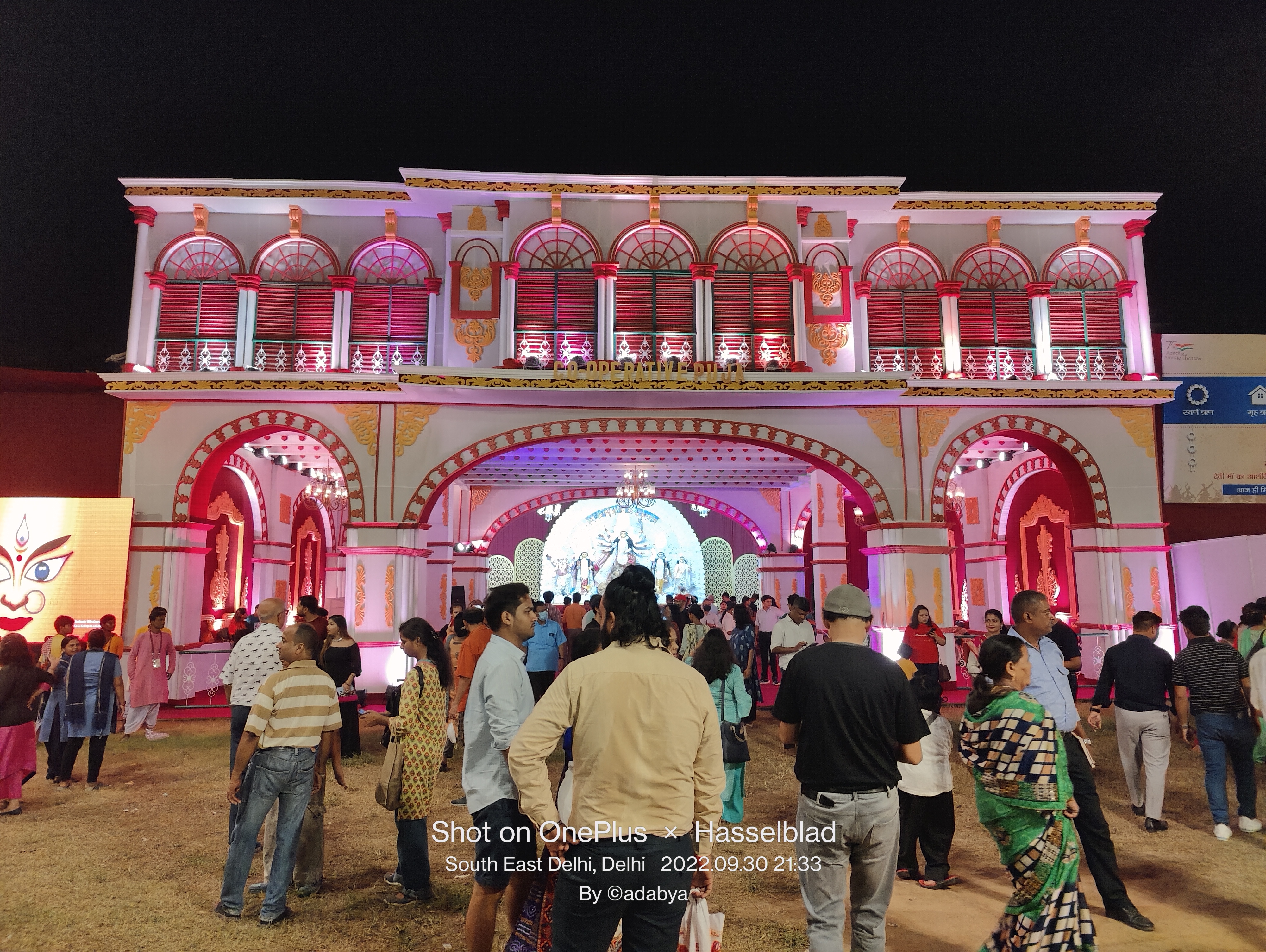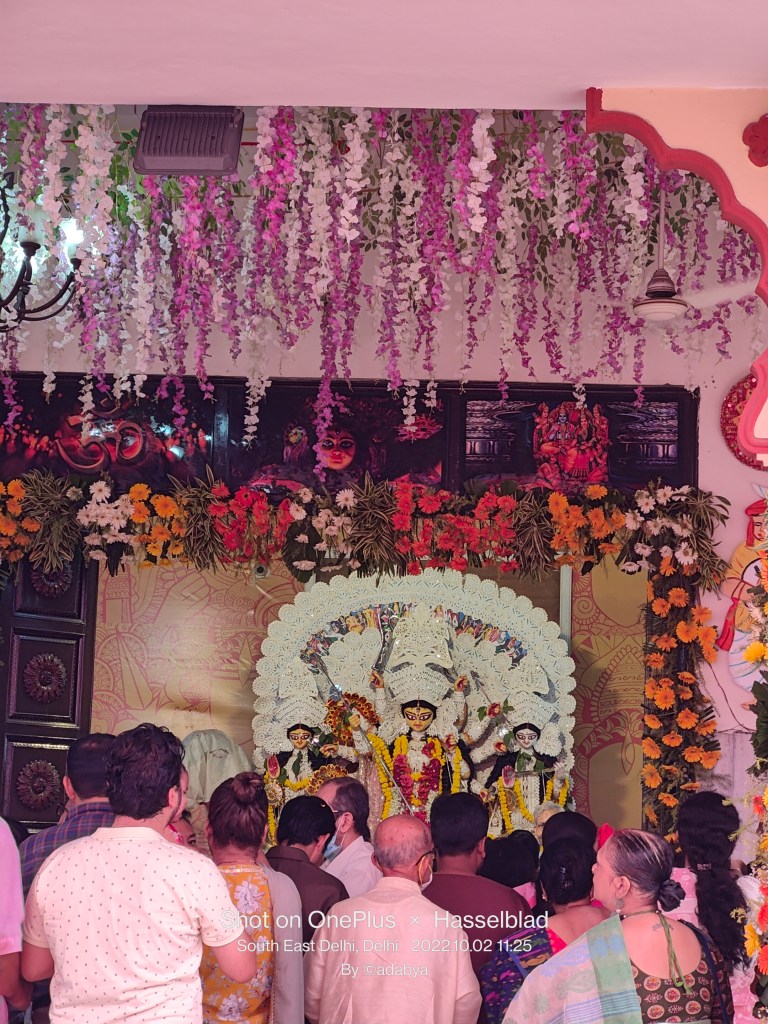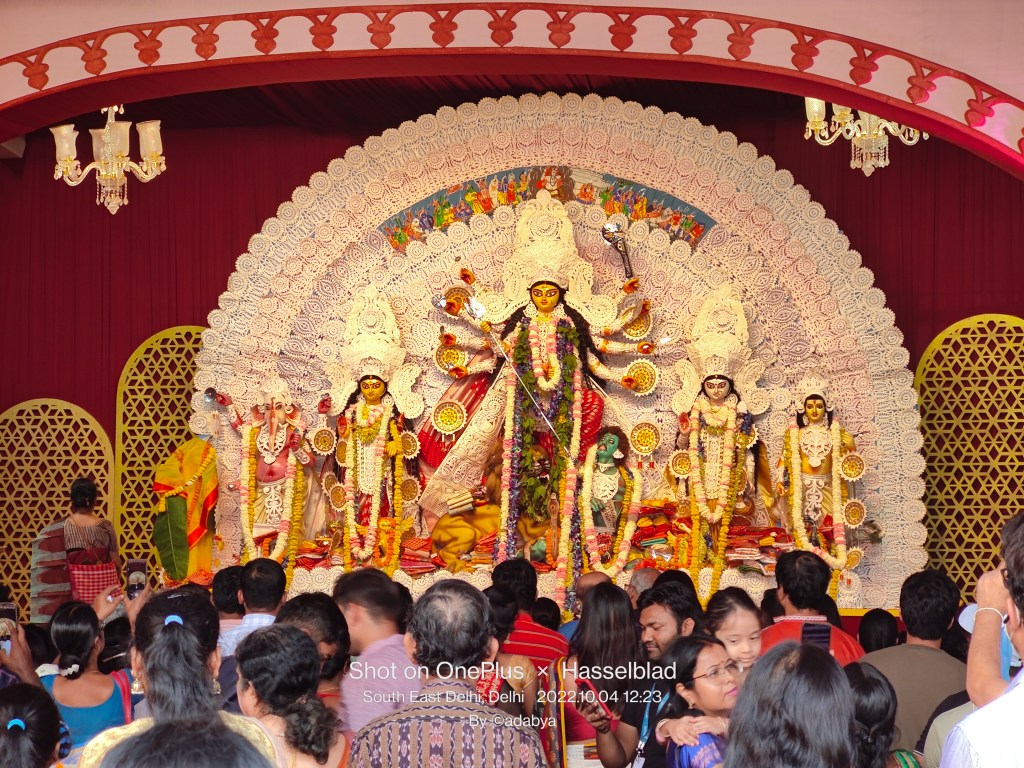 The following morning, Maha Saptami day, Deepika wanted to give Pushpanjali so we went to Durgabari in Kailash Colony where I unexpectedly bumped into my Childhood friend Supriyo. We chatted while both our better halves were busy offering the flowers and praying to the deity. Thereafter, Deepika & I went to New Delhi Kali Bari, a must visit during Durga Puja for all Bongs residing or visiting Delhi. The Basus also joined us there. In the pre-covid years, one could enter the NDKB Pandal wearing their shoes/sandals but this time (or perhaps during covid years) the rules had changed and one had to take off their shoes at the entrance gate and deposit with the shoekeeper.  Our next stops were Minto Road pandal followed by Kashmere Gate Puja Pandal. The last one is the oldest continuous Durga Puja of Delhi and once upon a time famous for the delectable Biriyani served at the food court, however, the quality over time has deteriorated and no longer an USP.