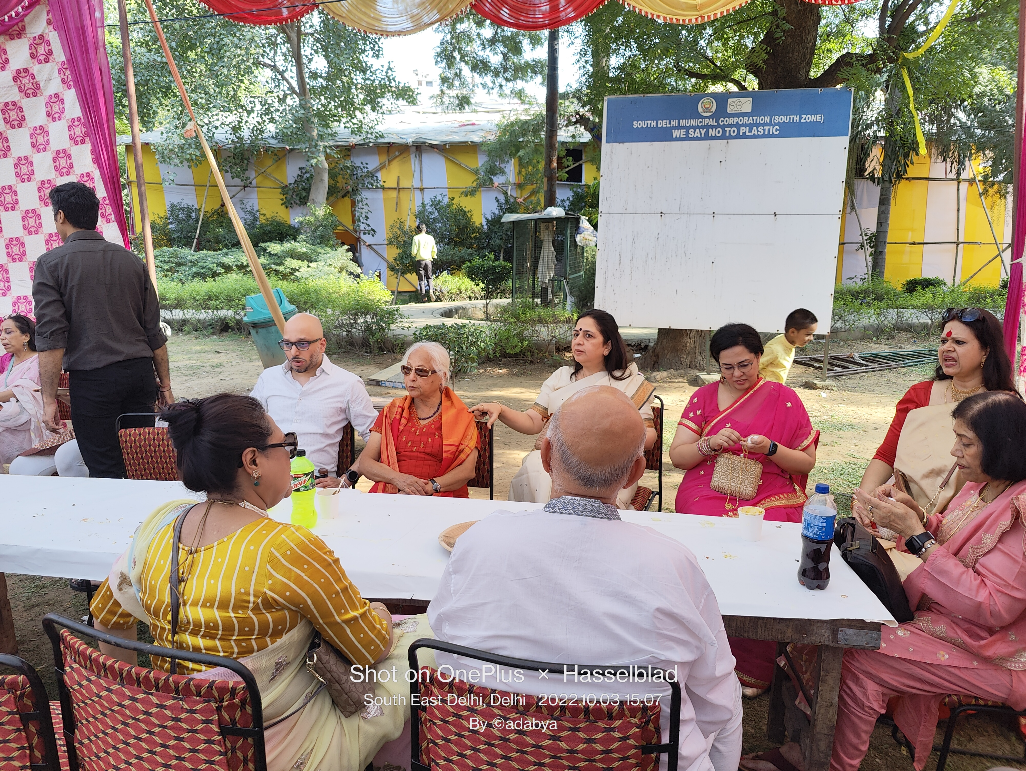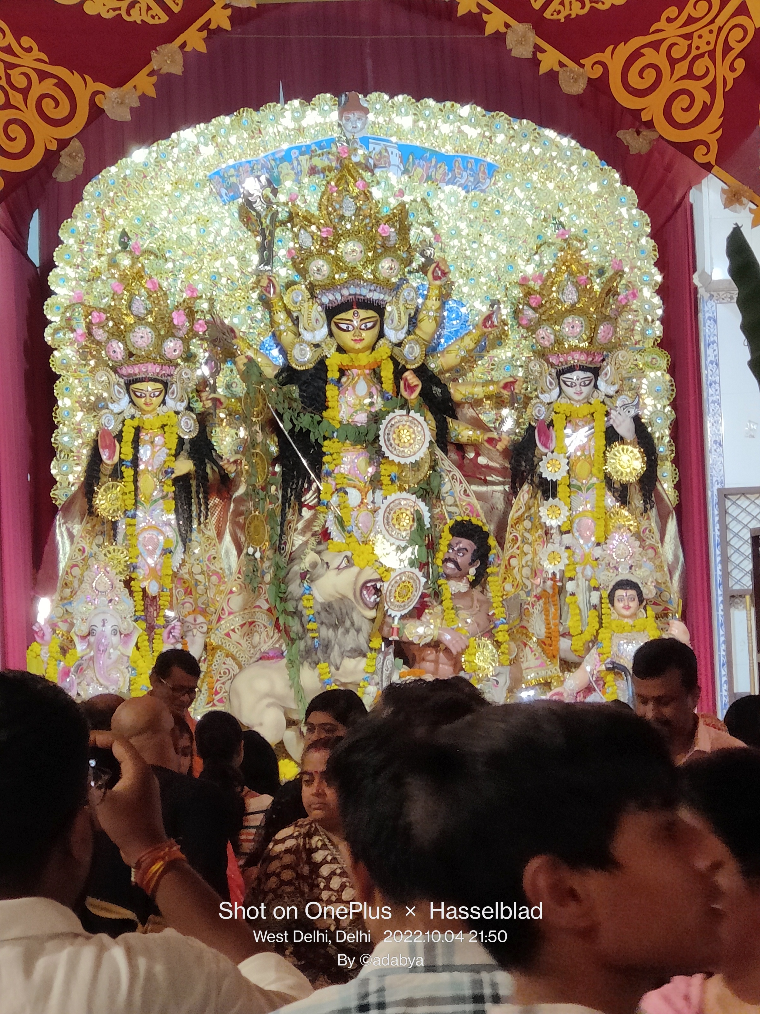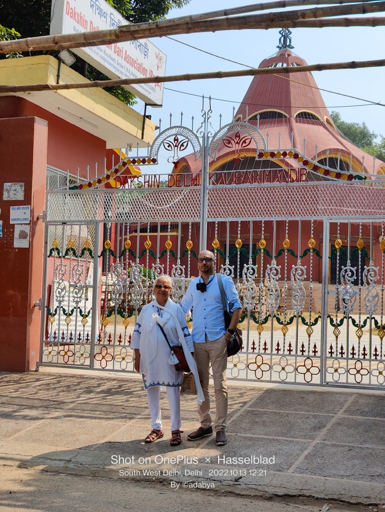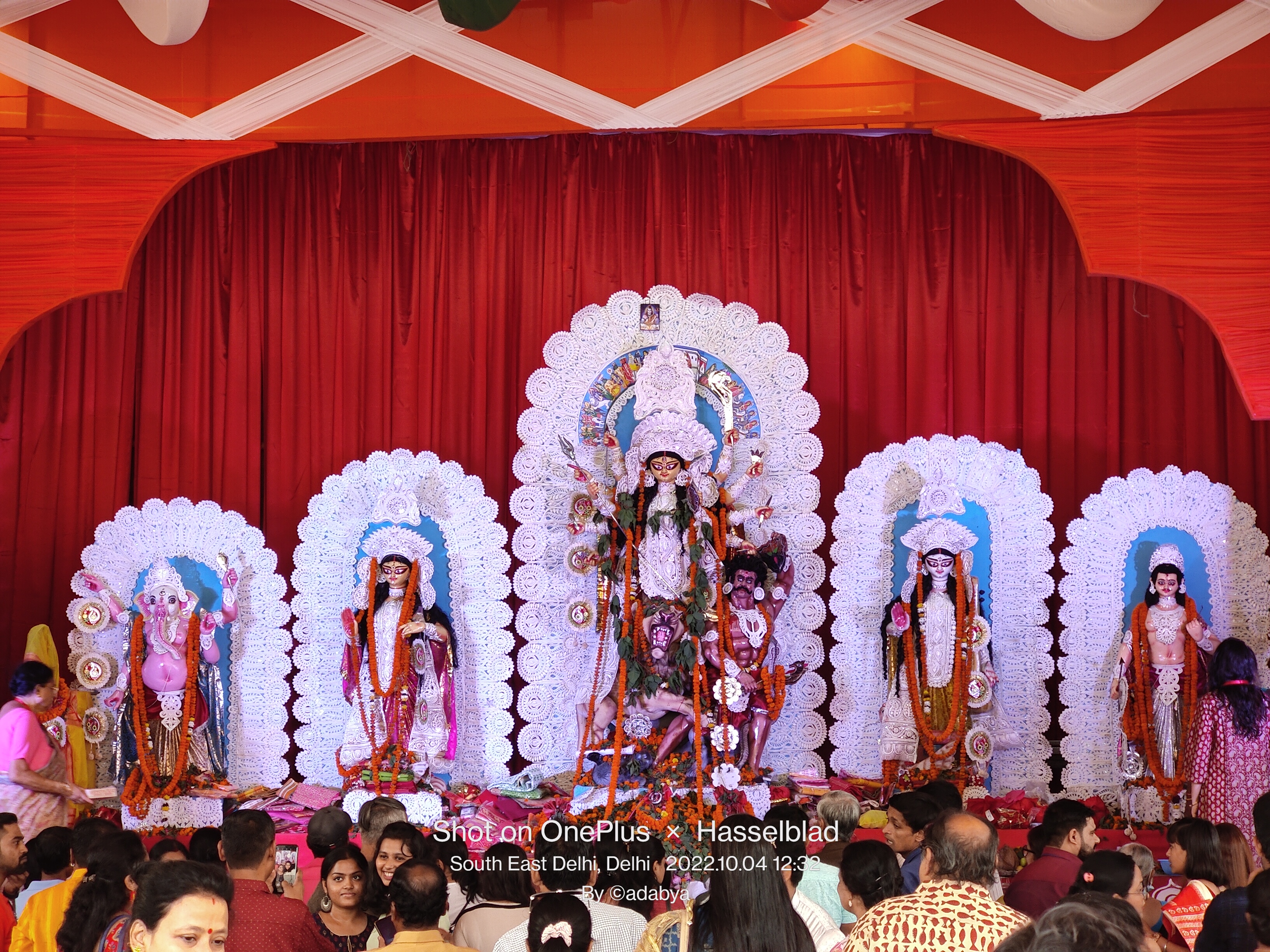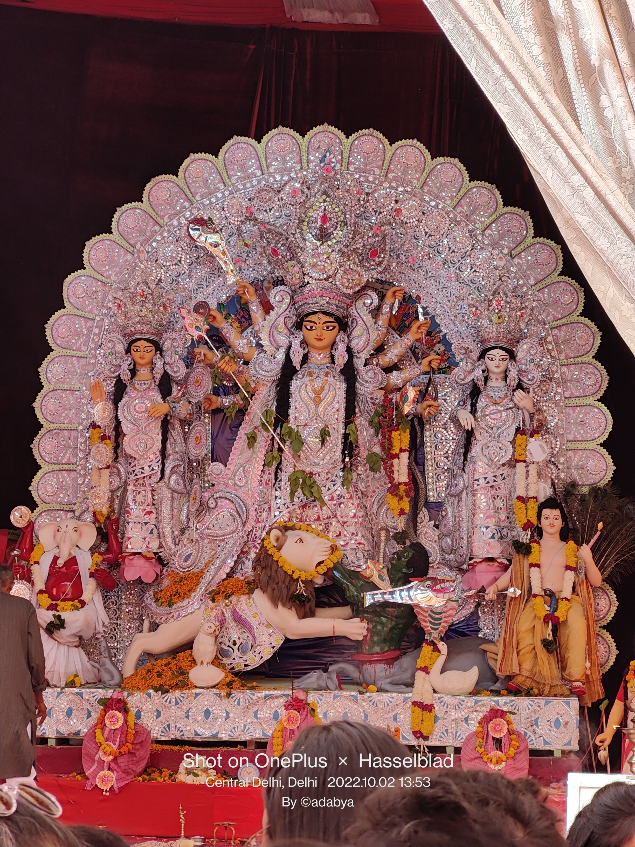 The following morning, Maha Saptami day, Deepika wanted to give Pushpanjali so we went to Durgabari in Kailash Colony where I unexpectedly bumped into my Childhood friend Supriyo. We chatted while both our better halves were busy offering the flowers and praying to the deity. Thereafter, Deepika & I went to New Delhi Kali Bari, a must visit during Durga Puja for all Bongs residing or visiting Delhi. The Basus also joined us there. In the pre-covid years, one could enter the NDKB Pandal wearing their shoes/sandals but this time (or perhaps during covid years) the rules had changed and one had to take off their shoes at the entrance gate and deposit with the shoekeeper.  Our next stops were Minto Road pandal followed by Kashmere Gate Puja Pandal. The last one is the oldest continuous Durga Puja of Delhi and once upon a time famous for the delectable Biriyani served at the food court, however, the quality over time has deteriorated and no longer an USP.