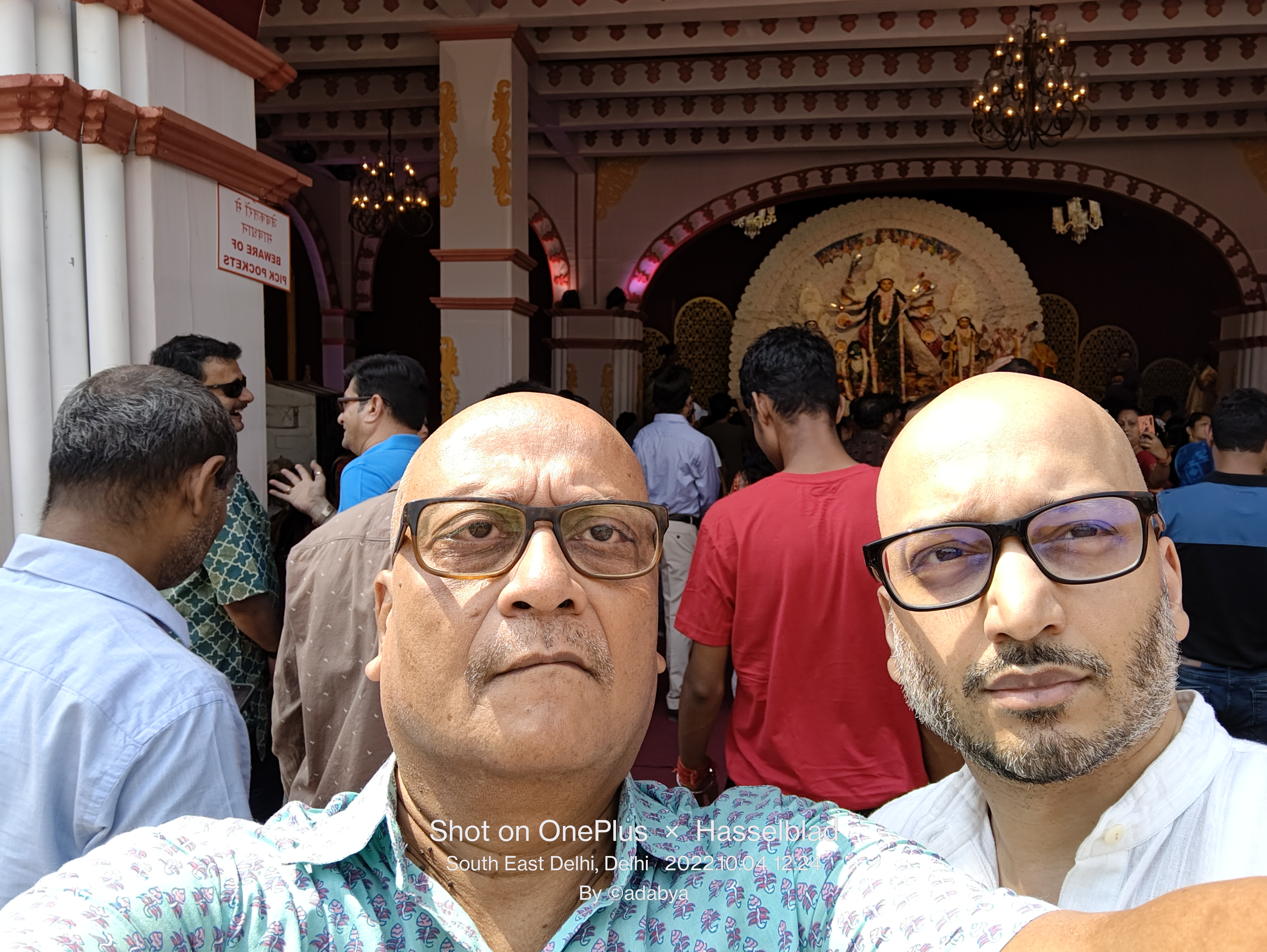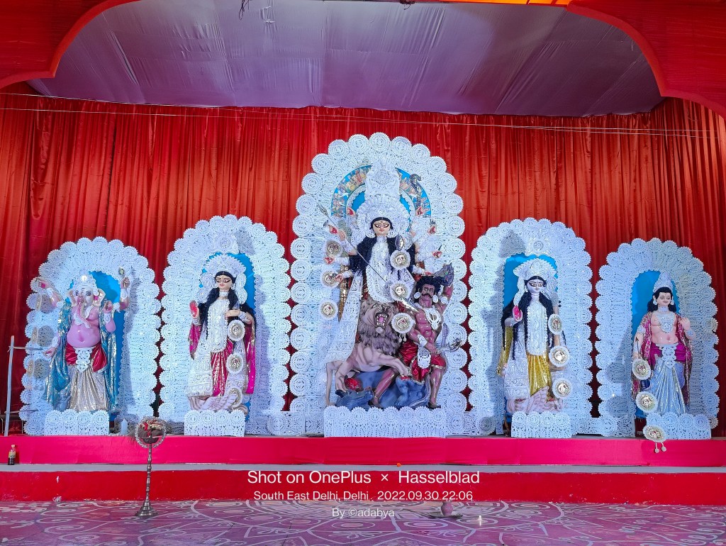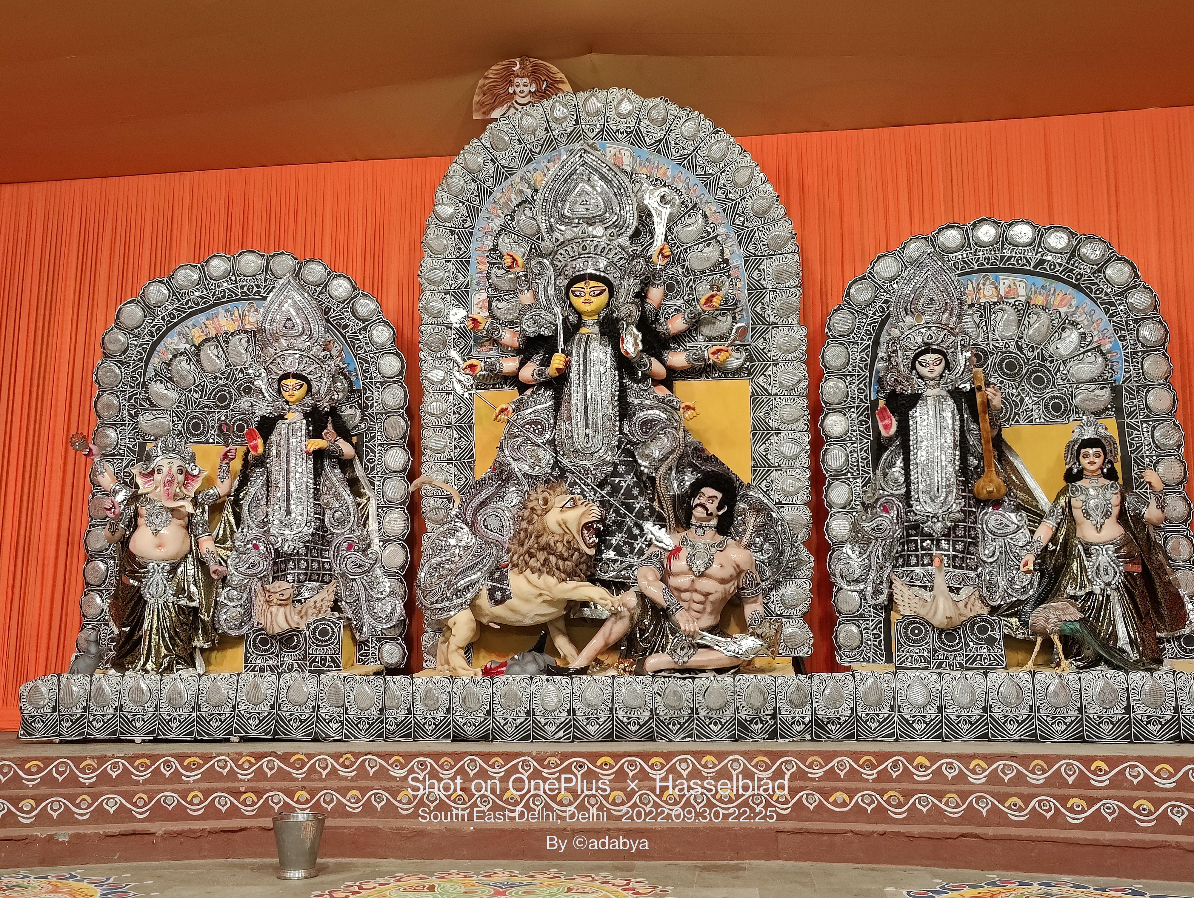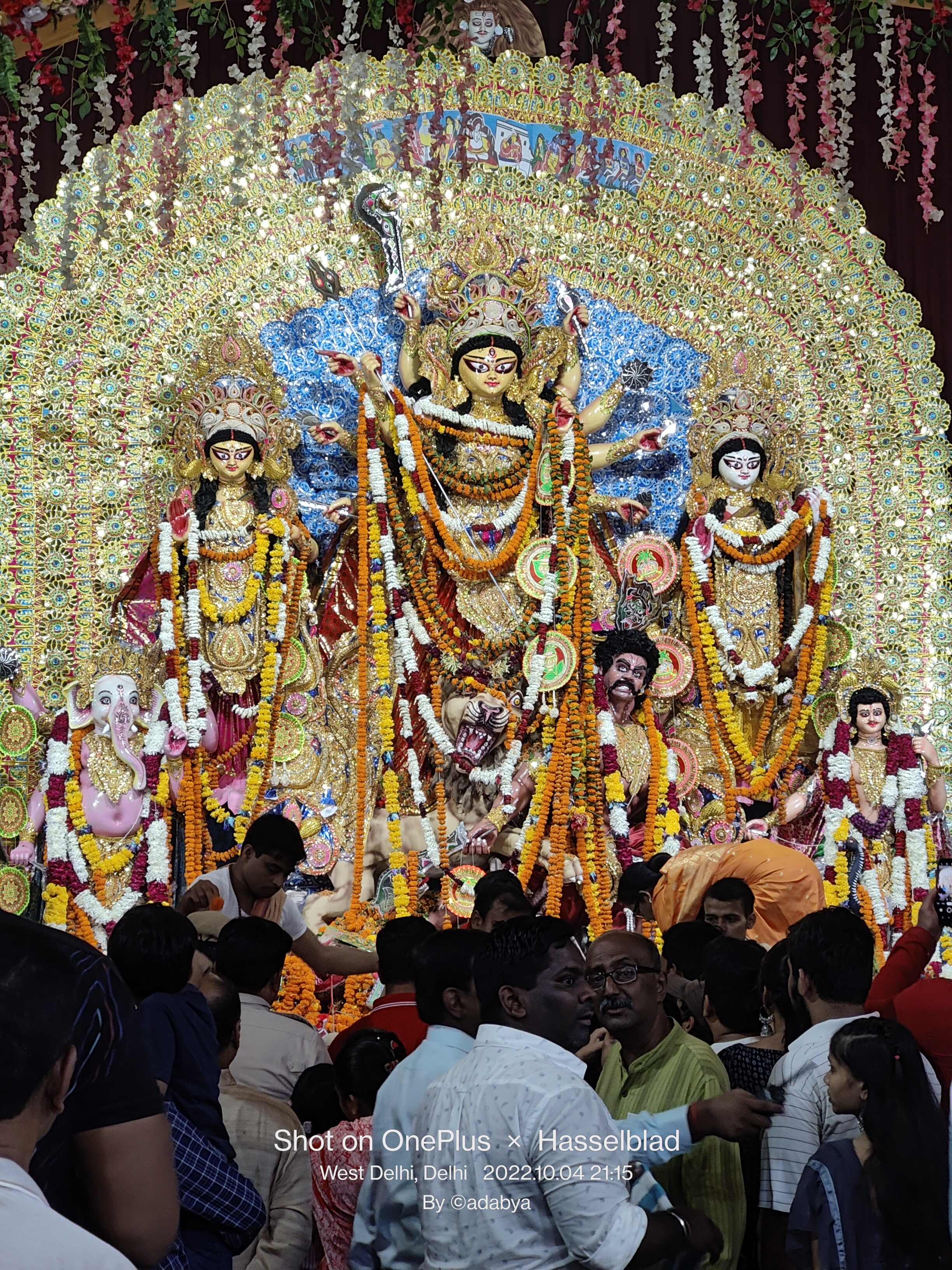 The following morning, Maha Saptami day, Deepika wanted to give Pushpanjali so we went to Durgabari in Kailash Colony where I unexpectedly bumped into my Childhood friend Supriyo. We chatted while both our better halves were busy offering the flowers and praying to the deity. Thereafter, Deepika & I went to New Delhi Kali Bari, a must visit during Durga Puja for all Bongs residing or visiting Delhi. The Basus also joined us there. In the pre-covid years, one could enter the NDKB Pandal wearing their shoes/sandals but this time (or perhaps during covid years) the rules had changed and one had to take off their shoes at the entrance gate and deposit with the shoekeeper.  Our next stops were Minto Road pandal followed by Kashmere Gate Puja Pandal. The last one is the oldest continuous Durga Puja of Delhi and once upon a time famous for the delectable Biriyani served at the food court, however, the quality over time has deteriorated and no longer an USP.