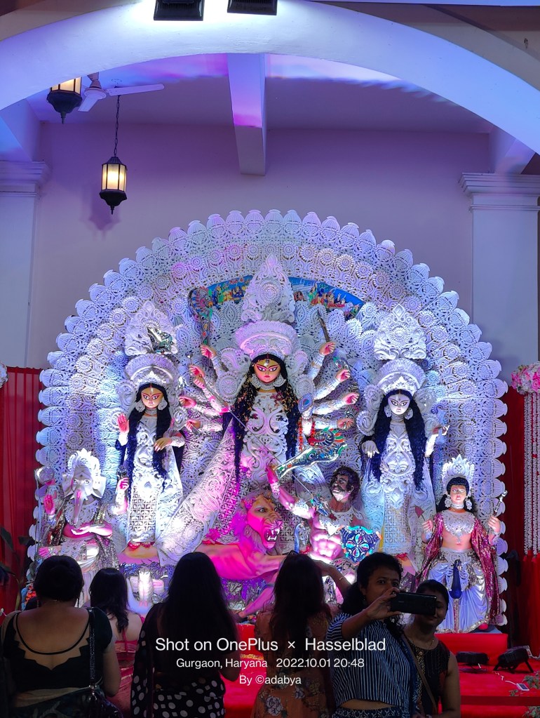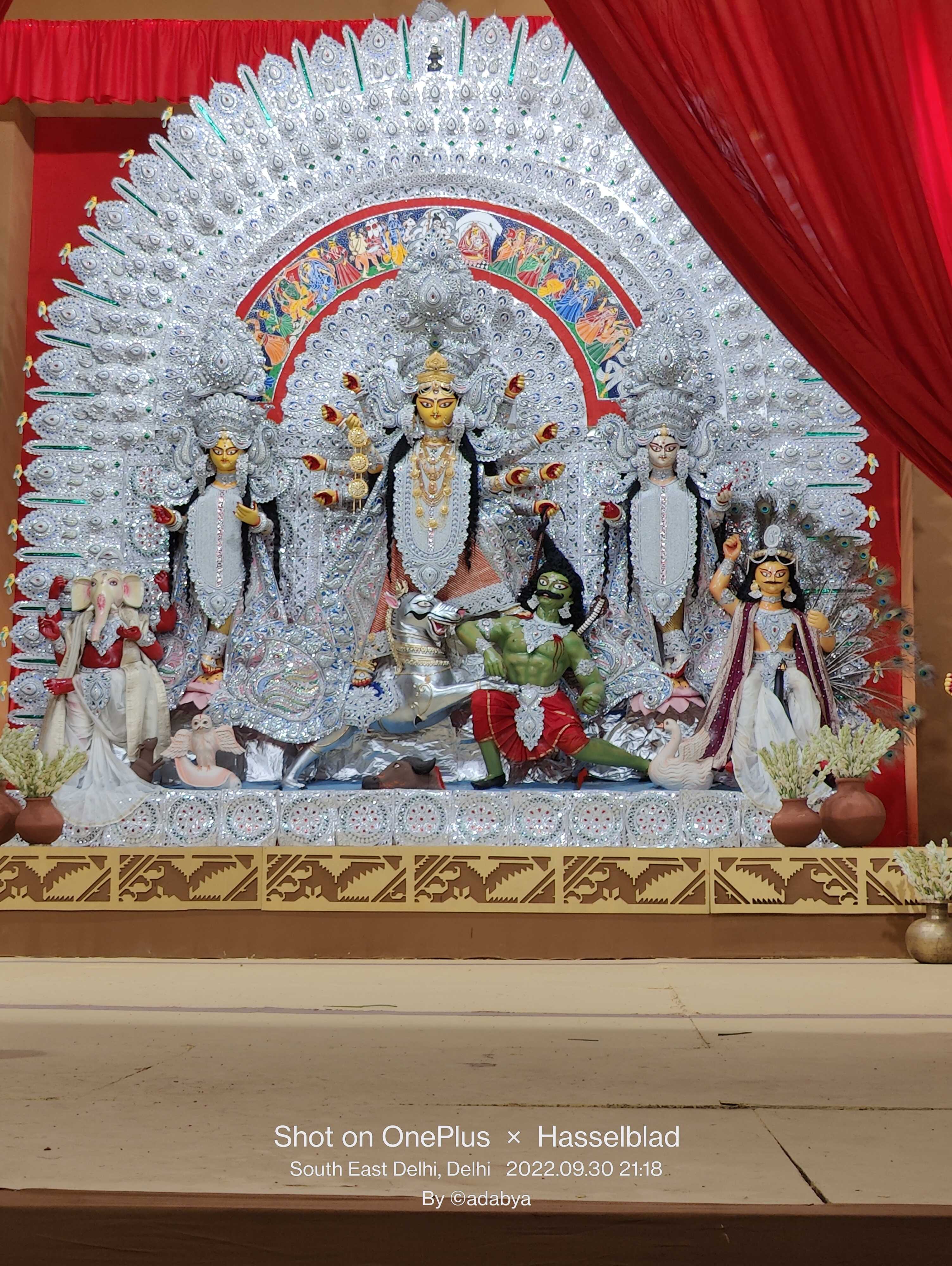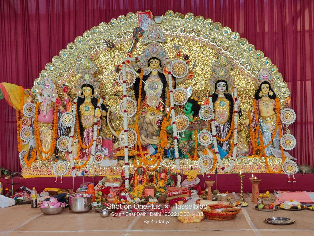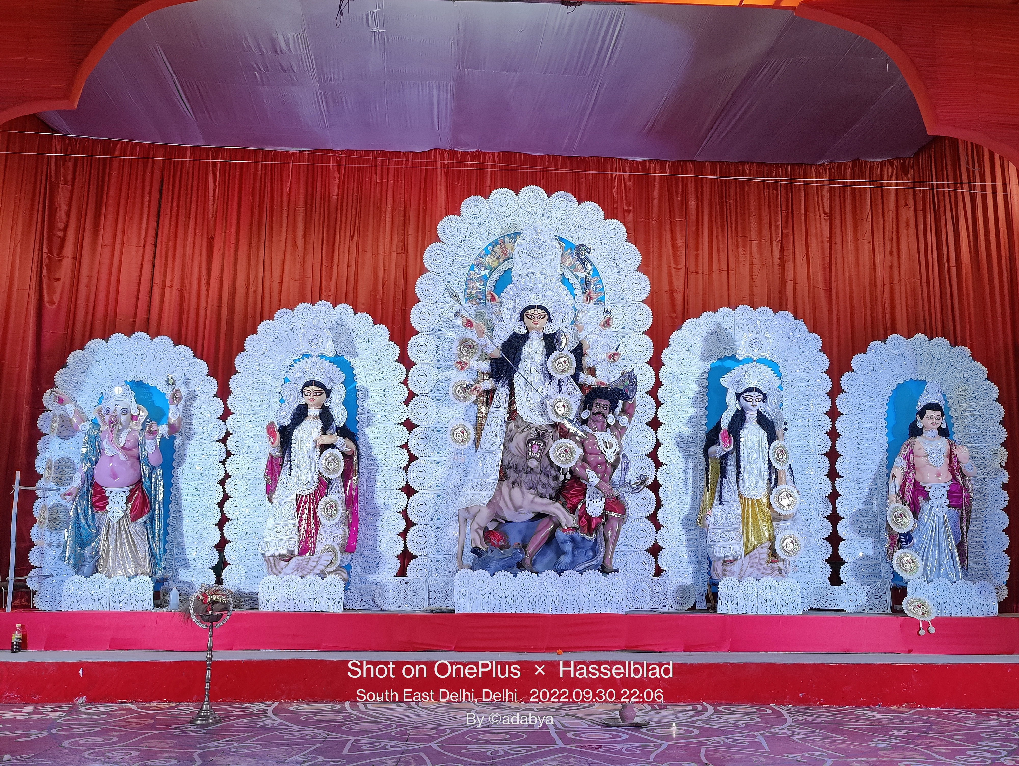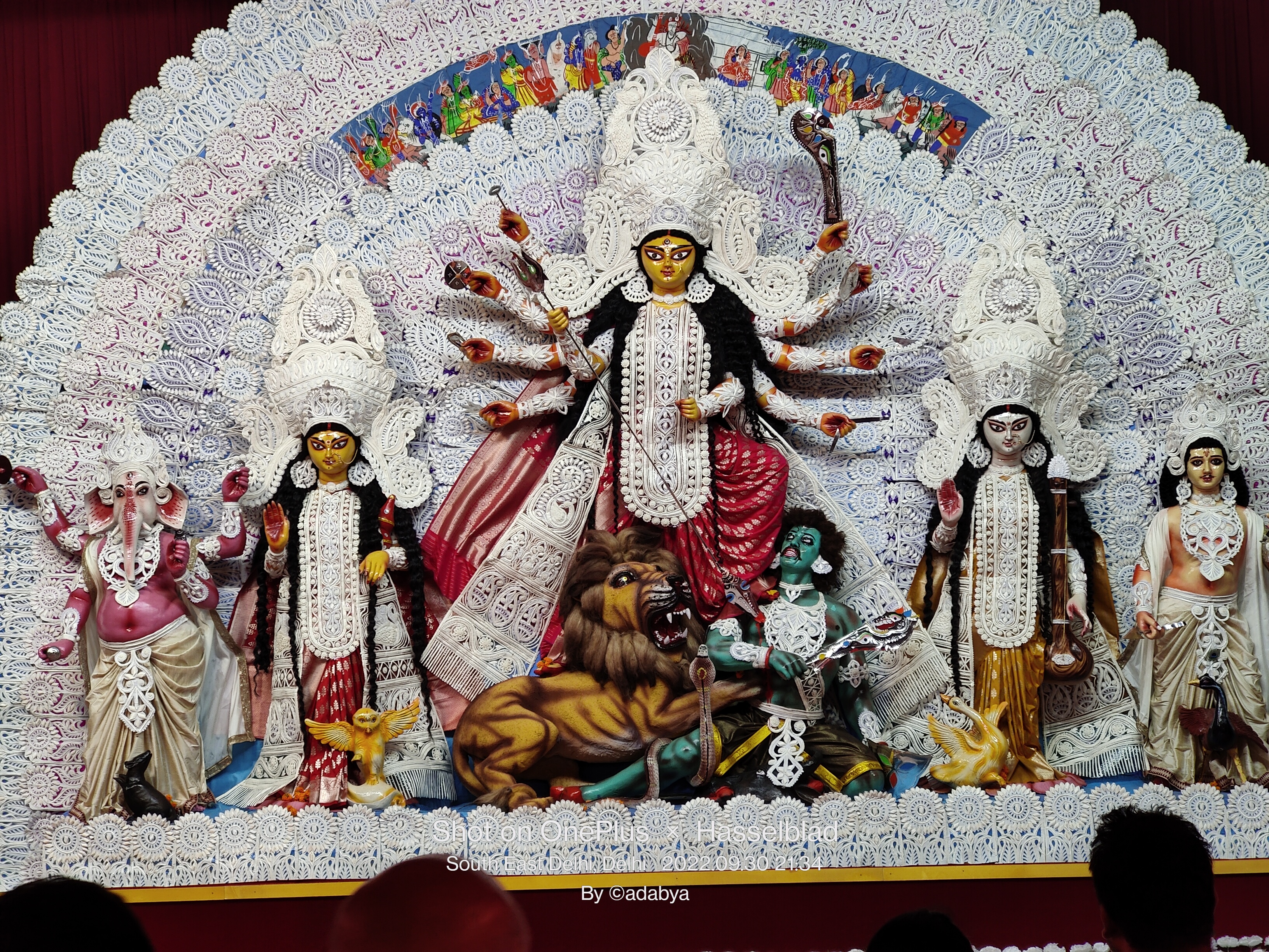The following morning, Maha Saptami day, Deepika wanted to give Pushpanjali so we went to Durgabari in Kailash Colony where I unexpectedly bumped into my Childhood friend Supriyo. We chatted while both our better halves were busy offering the flowers and praying to the deity. Thereafter, Deepika & I went to New Delhi Kali Bari, a must visit during Durga Puja for all Bongs residing or visiting Delhi. The Basus also joined us there. In the pre-covid years, one could enter the NDKB Pandal wearing their shoes/sandals but this time (or perhaps during covid years) the rules had changed and one had to take off their shoes at the entrance gate and deposit with the shoekeeper.  Our next stops were Minto Road pandal followed by Kashmere Gate Puja Pandal. The last one is the oldest continuous Durga Puja of Delhi and once upon a time famous for the delectable Biriyani served at the food court, however, the quality over time has deteriorated and no longer an USP.