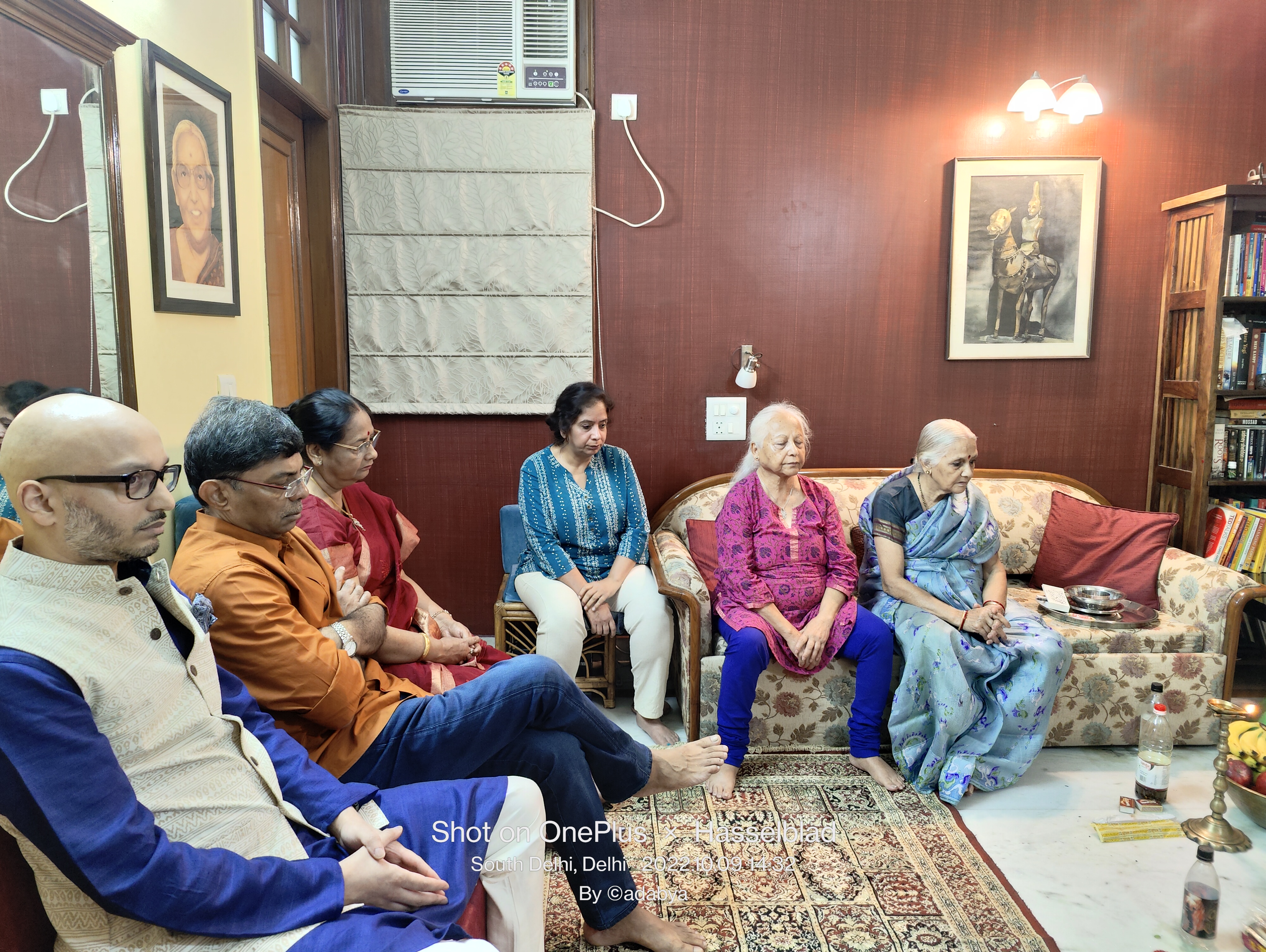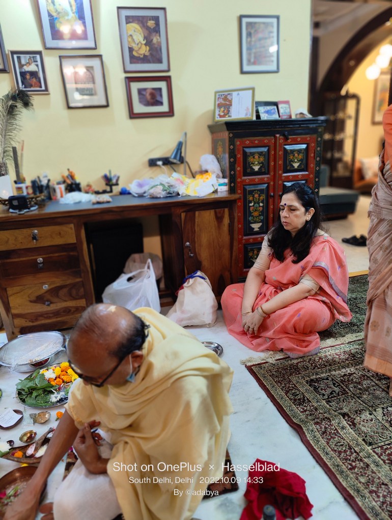 This year, for the Kojagori Lakshmi Puja, a new Panditji came over, the younger brother of our original Panditji who could not come to Delhi due to health issues. The new PanditJi who came had retired from NDKB few months ago and was much involved in the rituals than his brother and took almost 3 hours to complete the process. But Deepika as well as the participants of the Puja rituals were extremely satisfied. And rewarded him generously… while I found him to be quite chatty… in the five minutes post puja interaction he told me all about his family!!